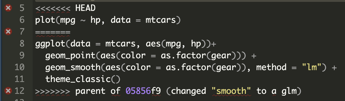 “===”: divides the two conflicting versions